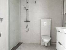 Kylpyhuoneessa on joko vaalea tai tummanharmaa laatoitus, tilaa löytyy myös pyykinpesukoneelle tai pesutornille. Lattialämmitys lisää mukavuutta, ja modernit vesikalusteet sekä integroitu wc-istuin viimeistelevät tilan tyylikkään kokonaisuuden.