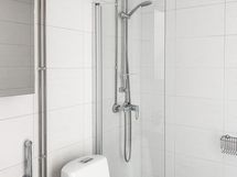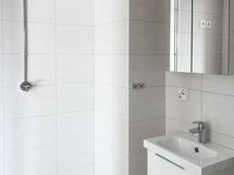 Tehosteseinä olohuoneessa tuo tilaan syvyyttä ja tyylikkyyttä. Kylpyhuone on laatoitettu tyylikkäästi valkoisen ja harmaan sävyin ja sieltä löytyy paikka pyykinpesukoneelle tai pesutornille sekä lasinen suihkuseinä.