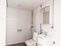 Kylpyhuone on tyylikkäästi laatoitettu harmaan ja valkoisen sävyillä, ja sieltä löytyy paikka pyykinpesukoneelle tai pesutornille. Lasinen suihkuseinä tekee tilasta avaran ja viimeistellyn. Ranskalainen parveke ja lattiasta kattoon ulottuva ikkuna tuovat runsaasti valoa ja avaruutta tähän kompaktiin kotiin.