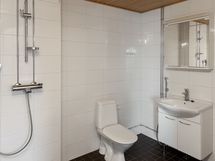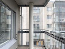Keittiössä on vaaleat kaapinovet, astianpesukone, keraaminen liesi ja harmaa välitilan laatoitus. Kylpyhuone on tilava ja laatoitettu ruskeansävyisellä lattialla ja valkoisilla seinillä, ja siellä on paikka pyykinpesukoneelle. Asunnossa on myös lasitettu parveke, jonne kuljetaan olohuoneesta.