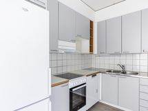 Tämä kaksio tarjoaa sujuvaa arkea toimivalla pohjaratkaisullaan. Keittiössä ovat harmaat kaapinovet, puun sävyinen työtaso ja vaalea välitilan laatoitus, jotka tuovat tilaan modernin ja raikkaan ilmeen.