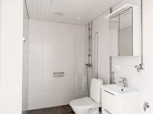 Kylpyhuone on tyylikkäästi laatoitettu harmaan ja valkoisen sävyillä, ja sieltä löytyy paikka pyykinpesukoneelle tai pesutornille. Lasinen suihkuseinä tekee tilasta avaran ja viimeistellyn. Ranskalainen parveke ja lattiasta kattoon ulottuva ikkuna tuovat runsaasti valoa ja avaruutta tähän kompaktiin kotiin.