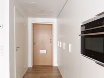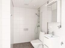Kylpyhuone on tyylikkäästi laatoitettu harmaan ja valkoisen sävyillä, ja sieltä löytyy paikka pyykinpesukoneelle tai pesutornille. Lasinen suihkuseinä tekee tilasta avaran ja viimeistellyn. Ranskalainen parveke ja lattiasta kattoon ulottuva ikkuna tuovat runsaasti valoa ja avaruutta tähän kompaktiin kotiin.