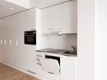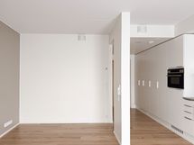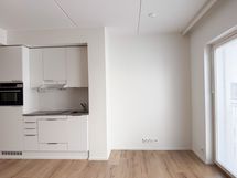 Koti avautuu harmonisena ja valoisana kokonaisuutena, jossa jokainen yksityiskohta tukee modernia ja helppoa asumista. Kaunis tammilaminaatti ja huolella valittu tehosteseinä tuovat syvyyttä ja lämpöä sisustukseen. Kompakti keittiö tarjoaa kaiken tarpeellisen arjen ruoanlaittoon ja on varustettu induktioliedellä, vaaleilla kaapeilla, harmaalla työtasolla sekä integroidulla astianpesukoneella.