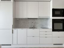 Keittotila on tyylikäs ja käytännöllinen, varustettuna induktioliedellä. Keittiön välitilaan on valittu tummaa tai vaaleaa marmoria jäljittelevä kuvio, joka elävöittää yleisilmettä ja tuo ripauksen näyttävyyttä.