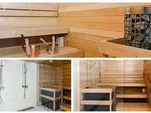 Kylpyhuoneessa on joko vaalea tai tummanharmaa laatoitus, tilaa löytyy myös pyykinpesukoneelle tai pesutornille. Lattialämmitys lisää mukavuutta, ja modernit vesikalusteet sekä integroitu wc-istuin viimeistelevät tilan tyylikkään kokonaisuuden.
