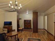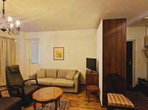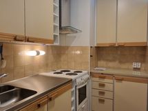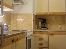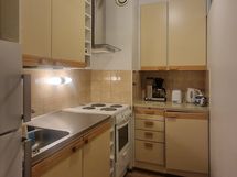- Keittiön varusteet: Jääkaappipakastin, liesi, liesituuletin ja uuni. Liesi: Valurautaliesi. Työtason materiaali: Laminaatti.