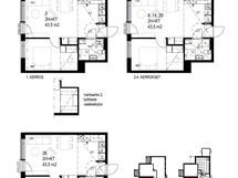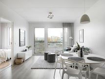Available rental apartments include one and two-bedroom homes ranging from 43,5 to 70,5 m². Each apartment has either a French or glazed balcony, and some apartments feature the added comfort of a private sauna. The apartments have laminate flooring and a fresh, light color scheme. Kitchen equipment includes a dishwasher, and the bathroom has space reserved for a washing machine.