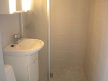 Suihku, suihkuseinä, wc-istuin, bidee, pesuallas, peili- ja allaskaappi.