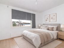 Makuuhuone sijaitsee omassa rauhassaan asunnon vasemmassa kulmassa, ja sieltä löytyy paljon kaappitilaa. Lisää säilytystilaa löytyy eteisestä. Kylpyhuone on hyväkuntoinen ja sävyiltään kauniin vaalea. Asunto on todella kompakti, ja sopii erinomaisesti esimerkiksi pienelle perheelle, pariskunnalle tai kimppa-asumiseen!
