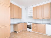 Asunnossa on tyylikäs beige laminaattilattia ja seinäpinnat ovat vaaleat. Keittiön kaapistot ovat kaunista puuta. Kylpyhuoneen seinäkaakelit ovat valkoiset, ja kylpyhuoneesta löytyy myös liitäntä pyykinpesukoneelle. Taloyhtiön alakerrassa sijaitsee myös kuntosali, joka on asukkaiden käytössä.