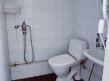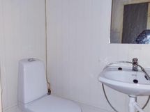 Pesutilojen varusteet: WC-istuin, suihku ja peilikaappi.