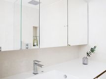 Peilikaappi, Allaskaappi, Lattialämmitys, Suihku, Suihkuseinä, Pesukone, Kuivausrumpu
