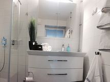 - Suihku, Suihkukaappi, Pesukone, Peilikaappi, Allaskaappi, Rättipatteri, Laattalattia, Laattaseinä, Halogeenivalot, Avattava ikkuna, Lattialämmitys