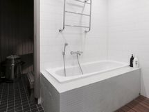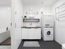 - Suihku, Kylpyamme, Pesukone, Kuivausrumpu, Peilikaappi, Allaskaappi, Rättipatteri, Halogeenivalot, Laattaseinä