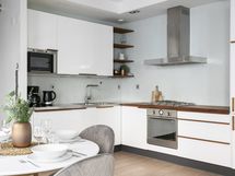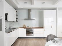 - Tilaa isolle ruokapöydälle, Paljon kaappitilaa, Paljon työskentelytilaa, Puutasot, Terästasot, Astianpesukone, Jääkaappi, Pakastin, Kaasuliesi
