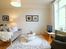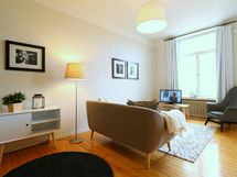 Welcome to this stylish and spacious studio apartment in the calm and trendy district of Punavuori, Helsinki. This apartment is fully furnished with complimentary Wi-Fi and is suitable for two guests in need of long-term accommodation. The bathroom of this apartment is tiled and is equipped with its own washing machine. You will also find a fully equipped kitchen with all the appliances you need: tableware, pots and pans, a dishwasher, oven, refrigerator, microwave, coffee machine and a kettle. There are a plethora of shops and services nearby, from grocery stores and small cafes to age-old brick-and-mortar stores, to fulfill your daily needs. From the surrounding area, you are able to find the park of Sinebrychoffin puisto, and just a couple blocks away, the beautiful shoreline opens up. Furthermore, commuting is a breeze, as numerous bus and tram lines run along Fredrikinkatu, to and from the epicenter of Helsinki. That being said, due to the excellent location, you are essentially within walking distance from all the major attractions in Helsinki.