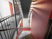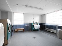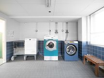 Tilava pyykkitupa helposti saavutettavissa suoraan rappuset alas katutasoon laskeutumalla.