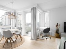 The apartment is spacious and bright due to a functional layout. From the remote work station you have a direct view to the sea. Trams 6 and 8 stop at the corner of the building and you have 100m walk to the shore, where opens a wide variety of different outdoor routes all the way to the Vanhankaupunginkoski and Lammassaari. Shopping Mall Arabia is 900m away, from which you will find the large grocery stores. Across the road there is Alepa for smaller groceries.