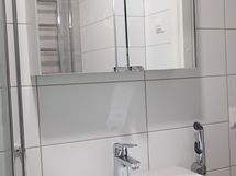 Laattalattia, Laattaseinä, Allaskaappi, Peilikaappi, Pesukone, Suihku, Suihkuseinä