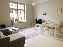 This beautiful and bright 4th floor home offers fully equipped kitchen with dishwasher and kitchenware, spacious living area and modern bathroom. Bedroom has 160cm wide double bed and a view over the courtyard. Neighborhood is one of the most beautiful surroundings in Helsinki and tram stop is just behind the corner.