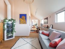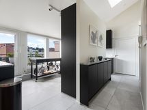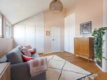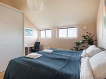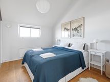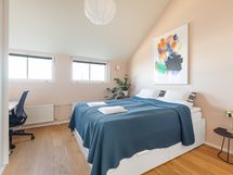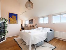 Kaksi erillistä makuuhuonetta 160 cm sängyillä ja paljon kaappitilaa vaatteille. Kotitoimiston levitettävä vuodesohva tekee tästä huoneesta tarpeen vaatiessa myös vierashuoneen. Kylpyhuoneen lisäksi erillinen vessa lähellä eteistä. Kattoikkunat tuovat asuntoon luonnonvaloa mutta eivät aukea. Asunnossa on asunut kissa.