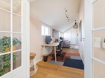 Nopea wifi, pariovilla suljettava kotitoimisto jossa toimistopöytä ja -tuoli sekä näyttö. Google Nest äänentoistojärjestelmä kaiuttimilla ympäri olohuonetta. Älytelevisio.