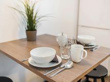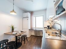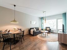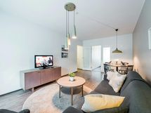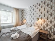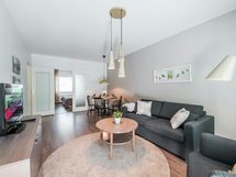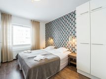 Scandinavian styled, cosy two bedroom-apartment with a private balcony for a perfect work or leisure getaway. The separate living room features maximum comfort thanks to the sofa set and armchairs, TV station and dining table. The separate kitchen is fully equipped with a refrigerator, freezer, dishwasher, microwave, coffee maker, kettle, toaster and full sets of dishes, cutlery, and kitchenware. There is a washing machine in the spacious bathroom and a large shower for refreshing baths. In each bedroom, there are two 90cm single beds. The flat has plenty of space, with a lot of storage room in wardrobes, dressers and even a walk-in wardrobe! The private balcony is a perfect place for a cup of coffee in the morning. Internet connection, bed sheets and towels are available free of charge. The apartment location is very close to well frequented public transportation hubs, shopping facilities, free time activities and restaurants.