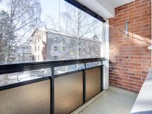 Ylimmän kerroksen valoisa ja toimiva kolmio lasitetulla parvekkeella, sekä runsaalla säilytystilalla.