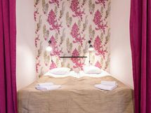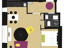 This large studio is ideal for four people, featuring stylish and fresh decor along with a functional floor plan. The studio includes an alcove with two single beds, each measuring between 80-90 cm, placed side by side. Additionally, the living room sofa converts into an extra bed. For privacy and easy darkening, the alcove can be closed off with curtains.