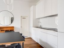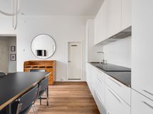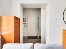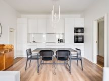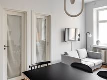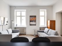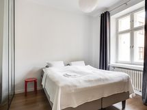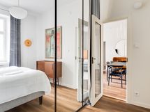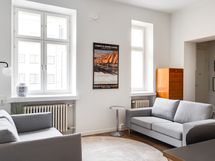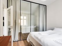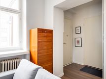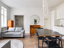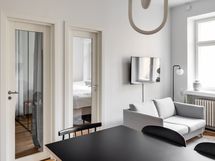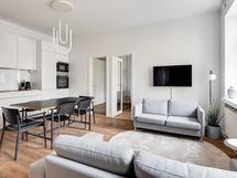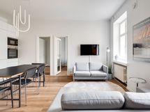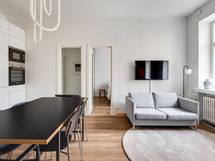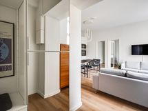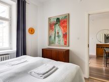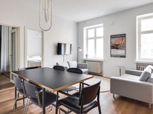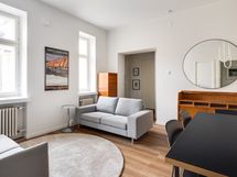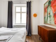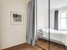 We are seeking a new tenant for a flexible stay at our centrally located apartment at Iso Roobertinkatu 24. This bright and tidy recently renovated one-bedroom apartment in Punavuori, Helsinki, is fully furnished and well-equipped. It features two convertible sofas, washing machine, dishwasher, and a king-size bed. Additionally, there is the option of a smaller bed in the "second bedroom", which is separated from the main bedroom by a glass wall and a blackout curtain.