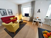 The stylish studio in Kruununhaka, Helsinki, is perfect for one or two guests seeking comfort and convenience. With fresh decor and a functional floor plan, the studio offers a versatile sleeping arrangement featuring a 100cm bed that extends to a 180cm double bed. Enjoy a bright shower room and a fully equipped kitchen complete with a refrigerator, freezer, microwave, coffee maker, kettle, toaster, and full sets of dishes and kitchenware.