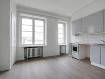 Tilava ja valoisa läpitalon yksiö erillisellä keittiöllä.
