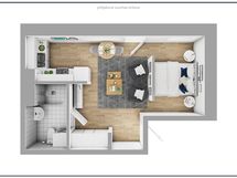 Tervetuloa tähän kolmannen kerroksen viihtyisään kotiin, jossa keittokomero tarjoaa yllättävän paljon säilytystilaa. Keittokomerosta löytyvät kaikki tarvittavat kodinkoneet: induktiotaso, kalusteuuni, jää-pakastinkaappi, paikka mikrolle – kaikki, mitä tarvitset sujuvaan arkeen.