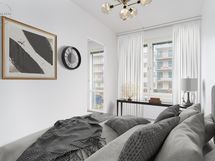 Makuutilaan mahtuu mukavasti sänky, ja tilaan on kulku kahdesta eri aukosta, mikä tekee pohjaratkaisusta avoimen ja toimivan. Ikkunoissa on sälekaihtimet, ja asunnosta avautuvat näkymät avaralle korttelipihalle.