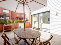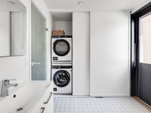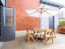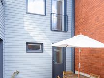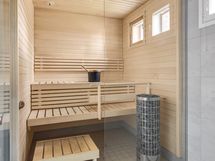 The home features three remote-work-friendly workstations, ample storage space, two large bathrooms with showers, a walk-in wardrobe, and a generous private yard. You can unwind in your own sauna or enjoy the outdoors in the backyard or on the terrace.