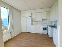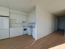 - Sähköliesi (4-lev.), jääkaappi/pakastin, liesituuletin, tilavaraus ja liitäntä astianpesukoneelle (ei astianpesukonetta). Valkoiset keittiökaapistot.