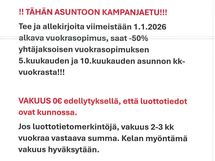 Tee ja allekirjoita viimeistään 1.1.2026 alkava vuokrasopimus, saat -50% yhtäjaksoisen vuokrasopimuksen 5.kuukauden ja 10.kuukauden asunnon kk-vuokrasta!!!