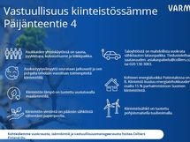 Päijänteentie 4-6 kiinteistön käytönaikainen sähkön ja lämmön käyttö on hiilidioksidipäästötöntä ja sähkö on uusiutuvaa energiaa. Kohteella on lisäksi käytössä uusiutuva maalämpö. Voit lukea lisää vastuullisuudesta Varman asunnoissa: https://www.varma.fi/vuokra-asunnot/ajankohtaista-vuokra-asunnoista/artikkelit/usein-kysyttya-varman-asuntojen-vastuullisuudesta/