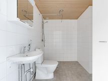 Laatoitettu kylpyhuone on tilava ja käytännöllinen. Varusteluun kuuluvat peilikaappi, sekä liitäntä pyykinpesukoneelle.