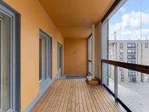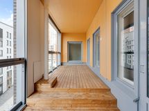 Asunnon upea terassiparveke avautuu kävelykadun suuntaan ja tarjoaa viihtyisää lisätilaa pitkälle syksyyn ja aikaisin keväällä.