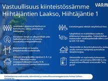 Voit lukea lisää vastuullisuudesta Varman asunnoissa: https://www.varma.fi/vuokra-asunnot/ajankohtaista-vuokra-asunnoista/artikkelit/usein-kysyttya-varman-asuntojen-vastuullisuudesta/.
