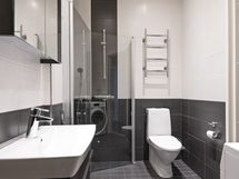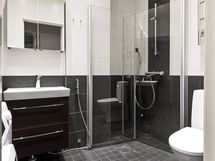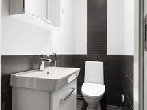 - Suihkuseinä, Pesukone, Kosteusvahti, Kuivausrumpu, Peilikaappi, Allaskaappi, Rättipatteri, Laattalattia, Halogeenivalot, Laattaseinä, Erillinen WC, Lattialämmitys