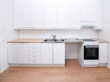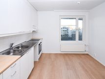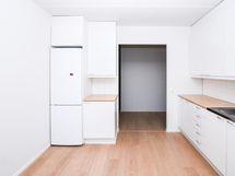 Keittiössä on jää-pakastinkaappi sekä varaus toiselle kylmälaitteelle ja astianpesukoneelle.