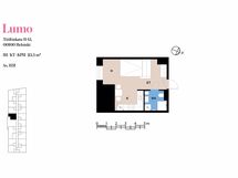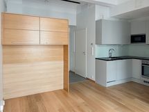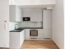 Pieni tunnelmallinen töölöläiskoti sinulle, jolle riittää pienet neliöt! Tässä Lumo-kodissa on toimiva kylpyhuone, johon saat oman pyykinpesukoneen. Altaan alla on kaksi vetolaatikkoa, peilikaapissa hyllyjä ja näiden lisäksi saat purkit ja purnukat ojennukseen korkeaan kaappiin altaan viereen. Keittotilasta löydät kaiken tarpeellisen: 45cm astianpesukone, mikroaaltouuni, induktiotasoliesi, uuni, jääkaappi-pakastin ja liesituuletin aktiivihiilisuodattimella Ikkuna suuntaa kohti talo sisäpihaa.