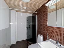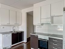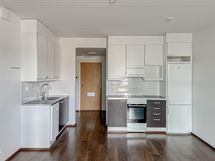 Tässä kaksiossa on ihanat lämpimän ruskeat tehosteväripinnat, avokeittiö, jossa induktioliesi sekä ranskalainen parveke makuuhuoneessa.