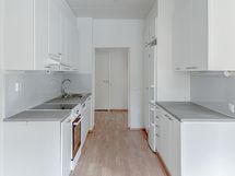 Lattia on laminaattia, seinät valkoiset -maalatut, keittiössä astianpesukone, induktioliesi, jääkaappi-pakastin. Kylpyhuone on laatoitettu.