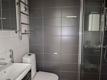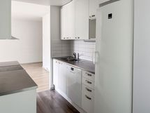 Vaaleassa keittiössä on valkoiset kaapinovet ja työtaso on harmaa. Keittiö on varusteltu erillisillä täysikorkeilla jää-viileäkaapilla ja pakastimella, keraamisella liedellä sekä astianpesukoneella. Mikroaaltouunille on tilavaraus. Kylpyhuone on laatoitettu ja värimaailmaltaan valko-harmaa. Pyykinpesukoneelle on liitännät ja tilavaraus.