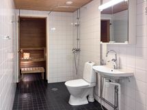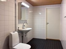 Lattiassa on laminaattilattia ja maalatut seinät. Keittiössä on valkoiset kaapinovet metallivetimillä ja työtasot ovat puun sävyiset sekä välitilan laatta valkoinen, astianpesukone kuuluu varustukseen. Kylpyhuoneessa on tummanharmaa laatta lattiassa ja valkoinen seinissä sekä pyykinpesukoneelle on mahdollisuus.