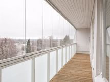 Tässä upeassa Lumo-kodissa on toimiva pohjaratkaisu. Makuuhuoneet sijoittuvat olohuone/ruokailutilan molemmille puolille. Suuremman makuuhuoneen yhteydessä on vaatehuone ja pienemmässä makuuhuoneessa on vaatekaapit. Keittotilassa on runsaasti työpöytätasoa ja ruokapöydälle on paikka olohuoneen puolella. Asunnon kruunaa koko asunnon levyinen upea lasitettu eteläparveke, jossa myös pieni suojaisa umpimainen osuus.